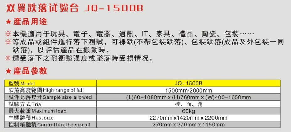 雙翼跌落試驗臺主要技術參數(shù):