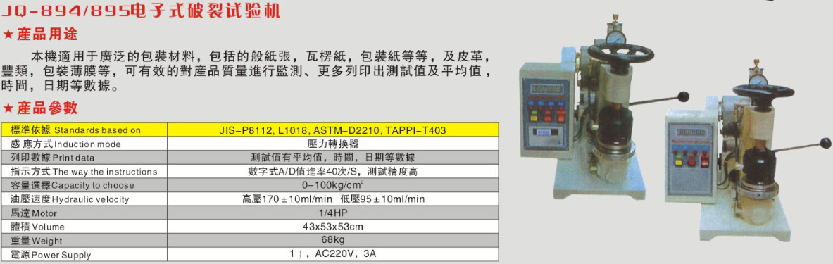 本儀器之設計符合ISO2759《紙板耐破度的測定》和GB/T1539《紙板的測定法》之標準要求。適用于以瓦楞紙包裝之制鞋、電子、電線、電器、五金、自行車、手提包、食品、家具等工廠,檢驗紙箱之抗破裂強度。亦可測試成皮﹑布類。采用訊號傳輸壓力,試料破裂時自動保留最大破裂強度值。