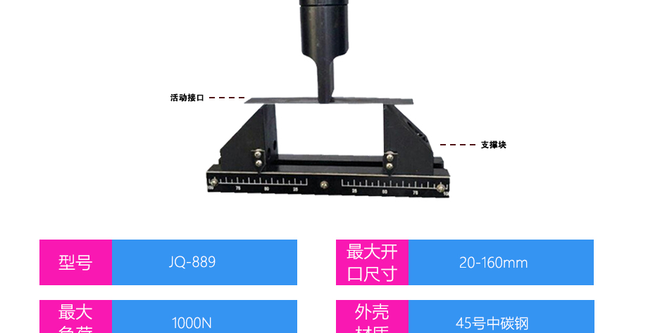 產(chǎn)品型號:JQ-889 品牌:劍 喬 用途:三點彎曲夾具適用范圍:鋼材、板材等材料的拉力,破壞力測試。